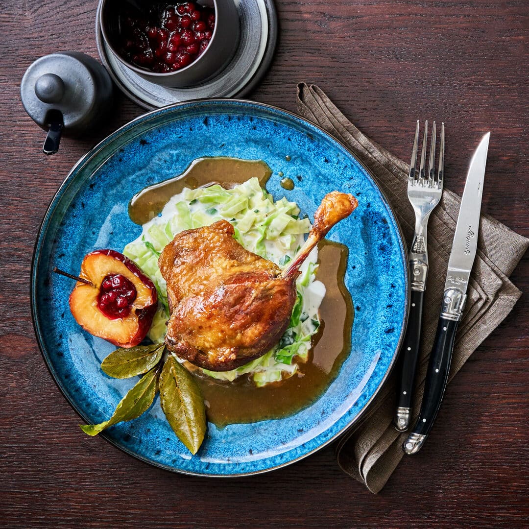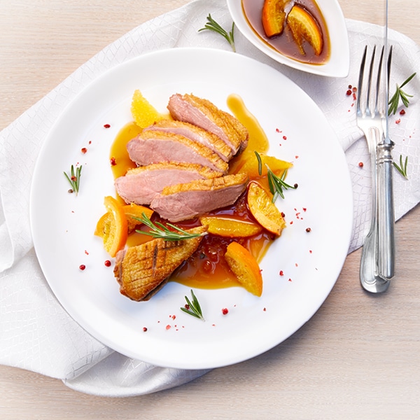 Die Keule der Ente eignet sich besonders für langsam gegarte Gerichte. Beim Schmoren entfaltet sich ihr voller Geschmack – ob klassisch mit Rotwein, Kräutern und Wurzelgemüse oder in fruchtig-würziger Variante. Ein Beispiel ist die geschmorte Ente in Würz-Orangen-Sauce, bei der sich die tiefe Aromatik des Fleisches mit feinen Zitrusnoten verbindet.
