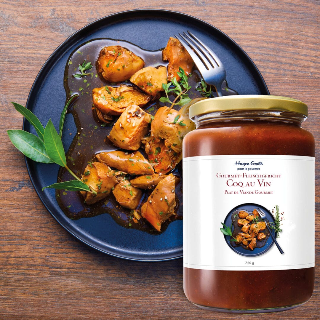 Wer es gerne schnell mag, greift auf unsere servierfertigen Gourmet-Klassiker mit Huhn zurück: Maishähnchen in Currysauce im Glas verbindet zartes Fleisch mit einer aromatischen, fein abgestimmten Sauce – ideal für die schnelle Küche mit Anspruch. Ebenso praktisch wie geschmackvoll ist auch der französische Klassiker Coq au Vin im Glas: In Rotwein sanft gegartes Huhn mit Gemüse und Kräutern – in wenigen Minuten servierbereit.