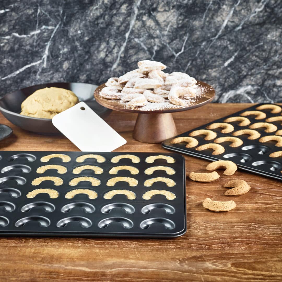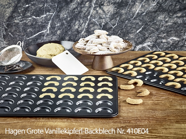 In Deutschland, Österreich und Tschechien gehören Vanillekipferl zu den beliebtesten Weihnachtsplätzchen. Der Mürbeteig wird mit gerösteten Mandeln oder Nüssen verfeinert und zu Hörnchen geformt. Mit einem speziellen Vanillekipferl-Backblech können Sie gleich mehrere Dutzend Kipferl auf einmal herstellen. Nach dem Backen werden sie noch warm in Puderzucker gewälzt.