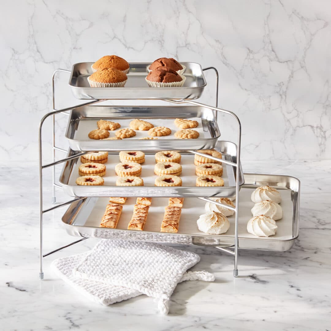 Auf einem mehrstöckigen Backblechständer können mehrere Bleche gleichzeitig auskühlen. Das spart Fläche und sorgt für Luftzirkulation. Zusammenklappbare Modelle lassen sich kompakt verstauen.