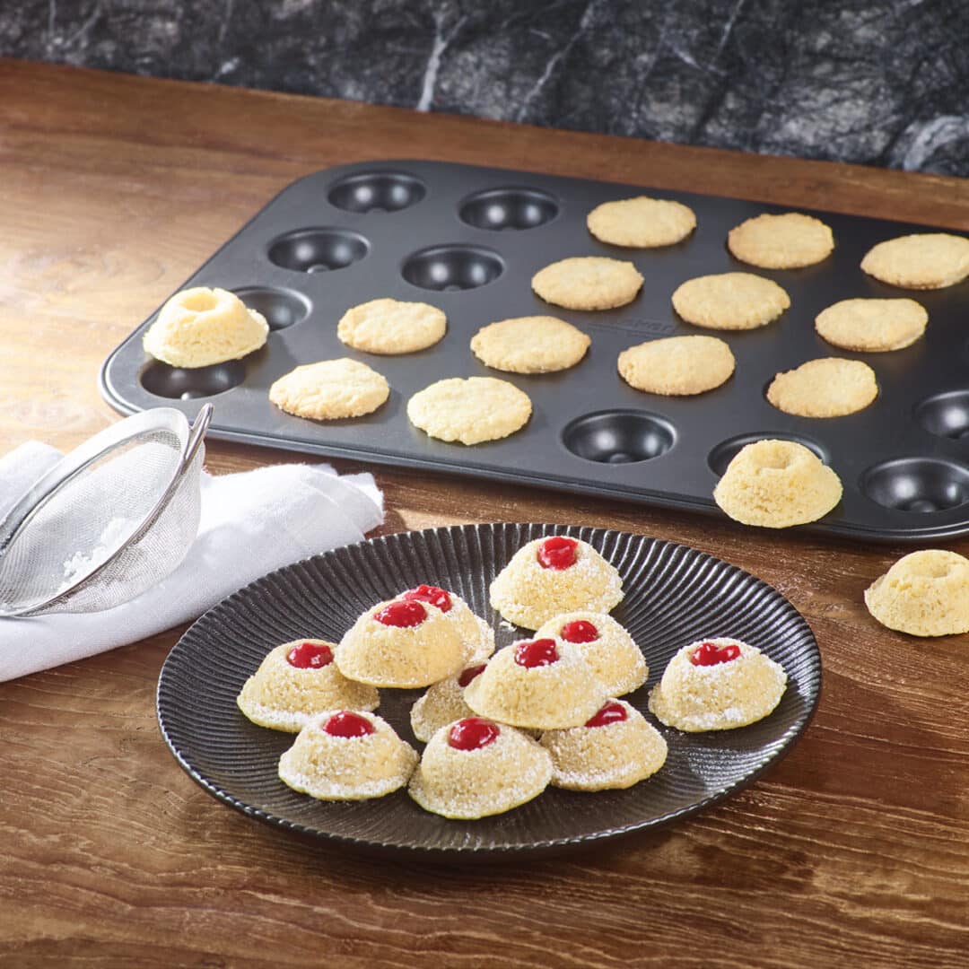 Auch als Husarenkrapfen bekannt: Der Haselnuss-Mürbeteig mit fruchtiger Marmeladenfüllung macht Engelsaugen zu einem zeitlosen Klassiker der Weihnachtsbäckerei. Mit einem passenden Engelsaugen-Backblech formen Sie im Handumdrehen gleichmäßige Plätzchen – perfekt für größere Backmengen.