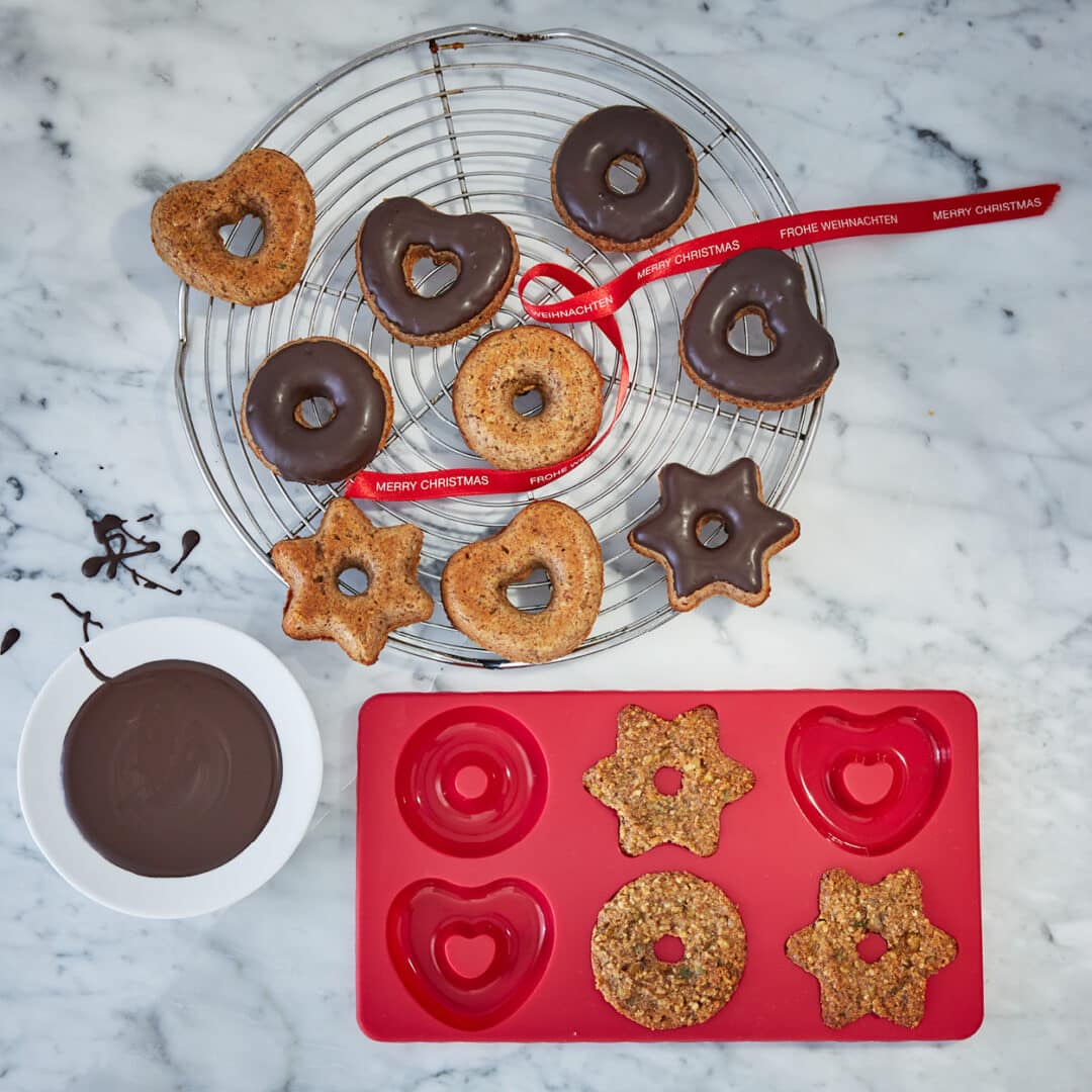 Lebkuchen, auch Pfefferkuchen genannt, gibt es in zahlreichen Variationen. Man unterscheidet zwischen braunen Lebkuchen wie Printen oder Baseler Leckerli und Oblaten-Lebkuchen wie den klassischen Elisenlebkuchen. Die Mischung aus Honig, Nüssen und weihnachtlichen Gewürzen macht Lebkuchen zu einem unverzichtbaren Bestandteil der Weihnachtsbäckerei. Besonders dekorative, kleine Varianten gelingen Ihnen mit einer Mini-Lebkuchen-Backform – ideal für Geschenke oder den bunten Teller. Viele weitere Inspirationen rund um kulinarische Präsente finden Sie auch in unserem » GenussMAGAZIN-Beitrag Geschenkideen für Hobbyköche.