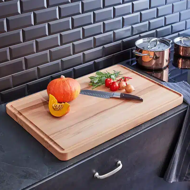 Die hohe Dichte des dampfbehandelten FSC – zertifizierten Buchenholzes schont im Vergleich zu Arbeitsflächen aus Marmor, Glas oder Edelstahl Ihre Messer. Tannine im Buchenholz machen das XXL-Küchenbrett besonders resistent gegen Bakterien und bauen Keime effektiv ab.