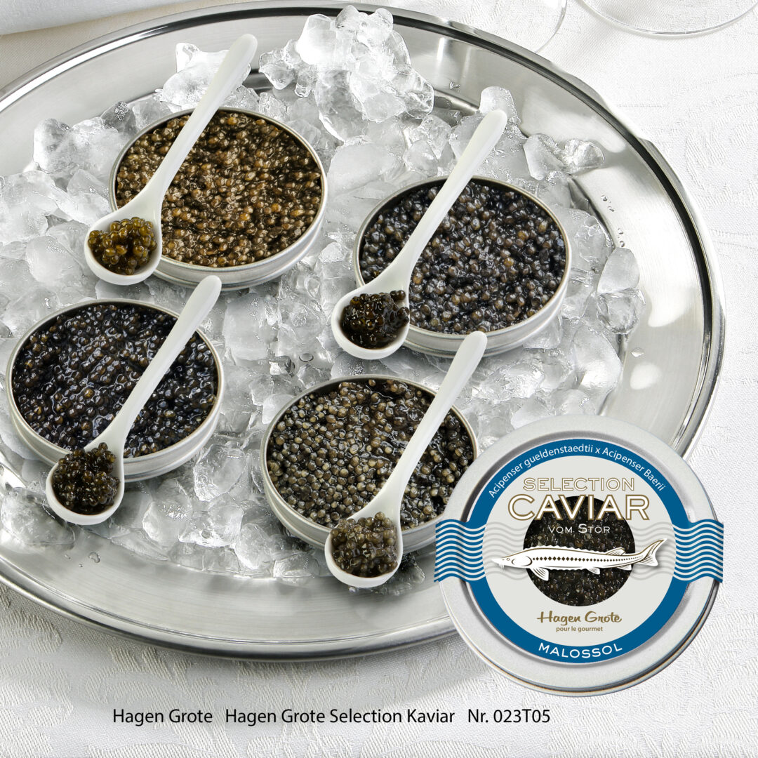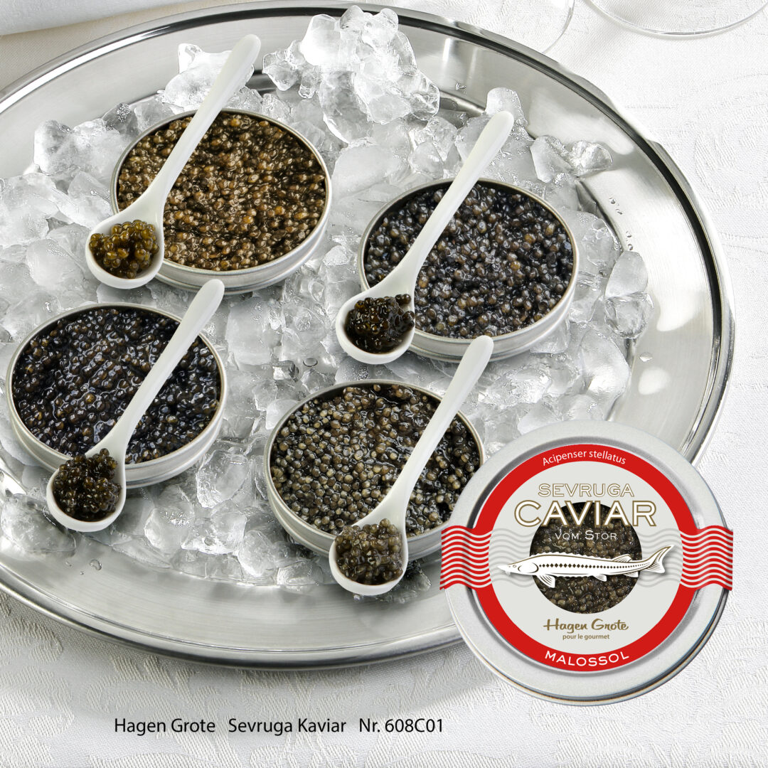 Vom Sternhausen, dem kleinsten Fisch aus der Familie der störartigen, wird diese Sorte gewonnen. Sevruga-Kaviar ist äußerst zartschalig und daher besonders empfindlich. Die mittel- bis stahlgrauen Körner verfügen über einen Durchmesser von 2 mm. Würzig und intensiv im Geschmack gelten sie als wahre Delikatesse. Feinster Sevruga Kaviar von Hagen Grote überzeugt zudem durch seine einmalige Cremigkeit sowie ein feines Meeresaroma.