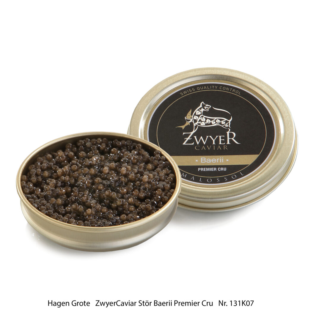 Beim auch als Imperial Baeri oder Sibirian Ossietra bezeichneten Baeri-Kaviar handelt es sich um Ossietra-Kaviar vom Sibirischen Stör. Er ist anthrazit bis schwarz gefärbt und weist in der Regel eine Körnung von 2,2-2,5 mm auf. Überzeugen Sie sich mit unserem ZwyerCaviar Stör Baeri Premier Cru von seinem wunderbar milden, aber dennoch absolut ausdrucksstarken Geschmack.