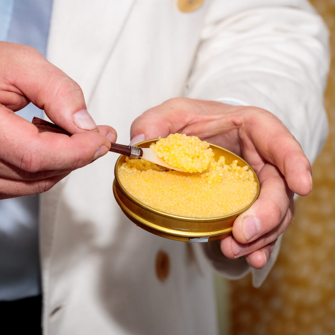 Äußerst wichtig im Umgang mit Kaviar ist auch, ihn keinesfalls mit Silber zu berühren. Silber oxidiert und verleiht dem Rogen dadurch einen unerwünschten, fischigen Geschmack. Auch den Kontakt mit anderen Metallen, abgesehen von Gold, unbedingt vermeiden.