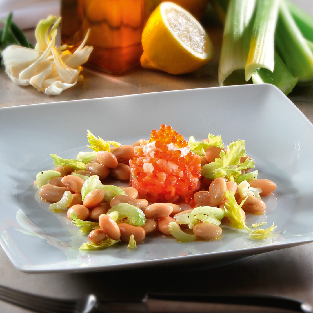 Eine edle Vorspeise ist unser Kaviar-Fischmousse auf Safran-Spargelsalat. Hier vereinen sich aromatischer Lachskaviar, geschmackvoller Spargel und fein-würziger Safran zu einer Gaumenfreude der Extraklasse. Auch unser Kaviar-Räucherlachstatar auf Bohnen-Bleichsellerie-Salat kombiniert unterschiedliche Aromen auf genussvolle Weise. Aromatischer Räucherlachs und delikater Forellenkaviar harmonieren wunderbar mit den milden Aromen des Salats.