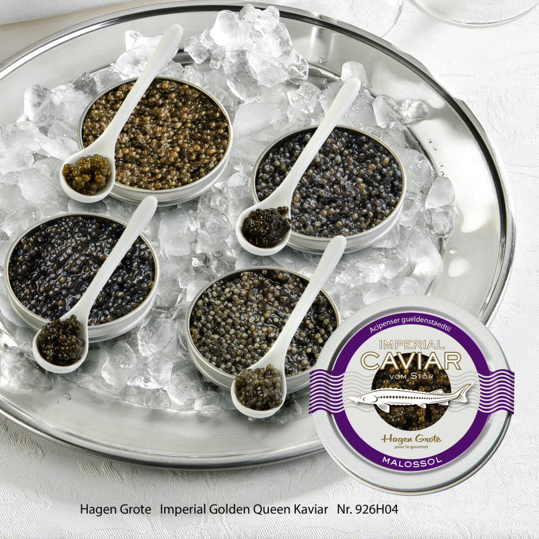 Auch Osietra, Ossetra oder Ossiotr genannt wird dieser Kaviar von Kennern äußerst geschätzt. Er stammt vom Ossietra-Stör (Russischer Stör). Im Vergleich mit Beluga-Kaviar verfügt er über eine härtere Schale sowie mit nur 2 mm Durchmesser über eine kleinere Körnung. Seine silbergraue bis schwarze Färbung schmückt oftmals ein feiner Goldschimmer. Sein nussiges Aroma ist unter den unterschiedlichen Kaviar-Sorten einzigartig. Mit unserem Ossetra Kaviar aus exklusiver Zucht können Sie sich von diesem einmaligen Geschmackserlebnis überzeugen. Gemäß des Artenschutzabkommens ohne Hormone, Antibiotika sowie weitere unerwünschte Zusatzstoffe reift diese kulinarisch wertvolle Delikatesse heran. Eine hocharomatische Spezialität für Kenner bieten wir mit der Sorte Imperial Golden Queen. Bei diesem Kaviar handelt es sich um eine der wohl edelsten auf dem Markt. Von erfahrenen, iranischen Kaviarmeistern wird die feine, hellgrau bis mittelbraun gekörnte Köstlichkeit auf einer IFS-zertifizierten Farm in China hergestellt.