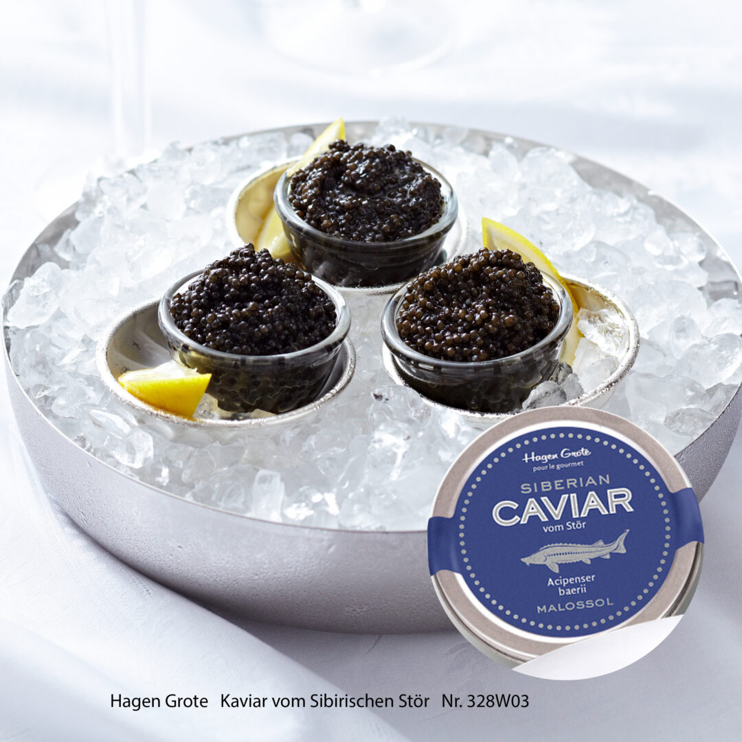 Beim sibirischen Stör, der auch unter dem Namen Sibirian oder Imperial baeri bekannt ist, handelt es sich um die in Westeuropa am häufigsten gezüchtete Art. Der Rogen weist einen Durchmesser von 2-3 mm auf. Die von anthrazit bis schwarz changierenden Körner sind zartschalig und verfügen über ein eindrucksvolles, würziges Aroma. Von diesem können Sie sich bei unserem hochwertigen Kaviar vom sibirischen Stör überzeugen. Die edle Delikatesse stammt aus erstklassiger, natürlicher Zucht und erfüllt die strengen Hagen Grote Qualitätsstandards.