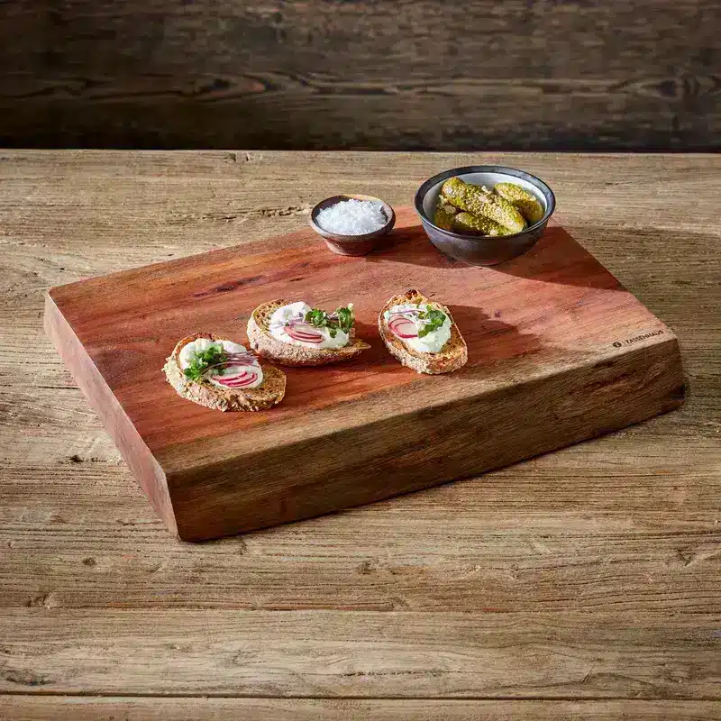 Die soliden Arbeits- und Servierbretter entstehen aus 5 cm starker Akazie aus nachhaltigem Anbau. Die schöne Optik, angenehme Haptik und hohe Widerstandsfähigkeit machen das Küchenbrett zu einem treuen und langlebigen Begleiter.