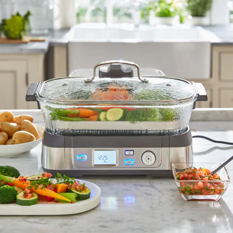 Dank seiner einzigartigen Technologie ist er bereits innerhalb von 30 Sekunden einsatzbereit. Ohne direkten Kontakt zu Wasser oder Garflüssigkeit garen Sie darin knackiges Gemüse, saftiges Fleisch, zarten Fisch.