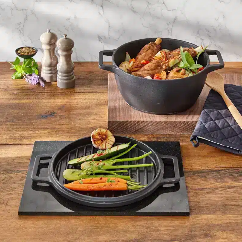 Ausgezeichnete Wärmeleit- und -speicherfähigkeit ist der entscheidende Vorteil von Guss-Kochgeschirr. Es nimmt Wärme schnell auf, speichert sie lange und gibt sie gleichmäßig wieder ab.