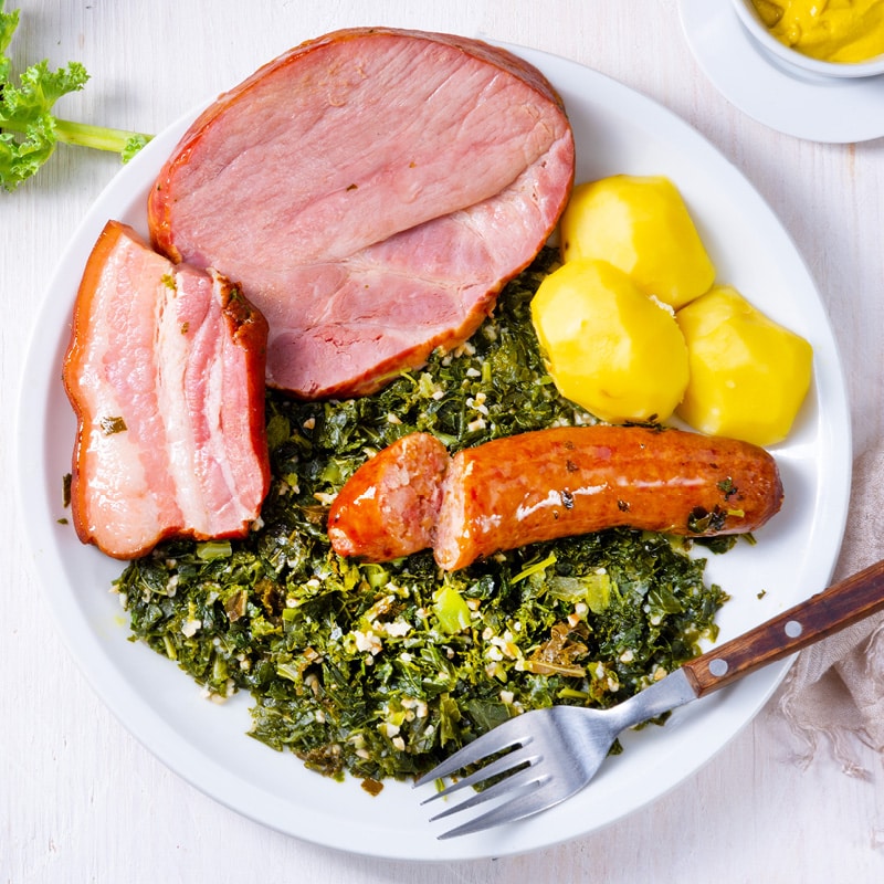 Grünkohl (Braunkohl) ist eine weltweit verbreitete, dickstängelige, vollkommen winterfeste Blattkohlart. Es wird gesagt, dass die Pflanze Frost ausgesetzt sein sollte, um ihre würzigen Aromen zu optimieren, was nicht richtig ist. Vielmehr ist eine späte Ernte für deren Geschmacksverbesserung entscheidend, da die Pflanze dann einen wesentlich höheren Zuckergehalt eingelagert hat. Als rustikales, typisch norddeutsches Gericht hat es “Kohl und Pinkel” zu einiger Bekanntheit gebracht. “Pinkel”, eine geräucherte Grützwurst, wird zusammen mit dem Kohl zubereitet und trägt mit ihrer kräftigen Würze wesentlich zum Gelingen des Gerichtes bei. Aber auch gepökeltes Fleisch wie Kassler und Speck werden bei der Zubereitung verwendet. Um die ausgeprägten Bitterstoffe zu mildern, sollten die Blätter vor der Zubereitung 3 Minuten in kochendem Wasser blanchiert werden. Dann werden sie zusammen mit angedünsteten Zwiebeln, der Fleischeinlage und Brühe in ca. 45 Minuten fertig gegart. Und ganz aktuell, Grünkohl wird seit neuestem als Smoothie getrunken.