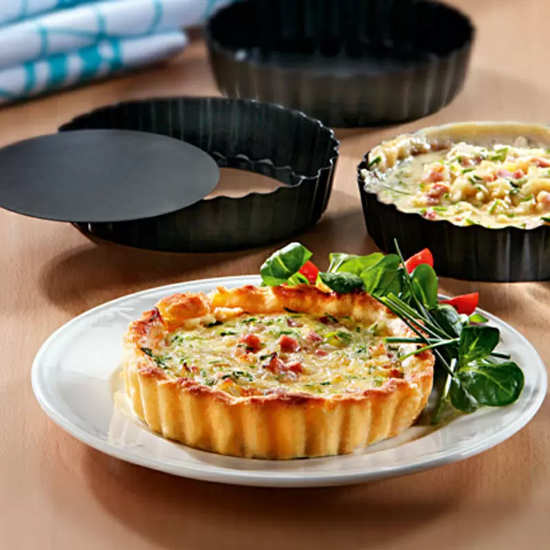 Komprimiertes, hartanodisiertes Aluminium (doppelt so hart wie Edelstahl), exzellente Wärmeleiteigenschaften, dauerhafte 3-fach-Teflon®-Platinum Antihaftversiegelung, Ø 28 cm, Ø mit Griffen 35,5 cm, 5,5 cm hoch, backofenfest bis 250 °C, wiegt 1,4 kg, geformter Rand mit integrierten Griffen, liegt beim Stürzen flach auf, induktionsfähig, spülmaschinenfest (zum Erhalt der Antihaftbeschichtung Handwäsche empfohlen) kommt mit Rezeptideen für süße und herzhafte Tartes.