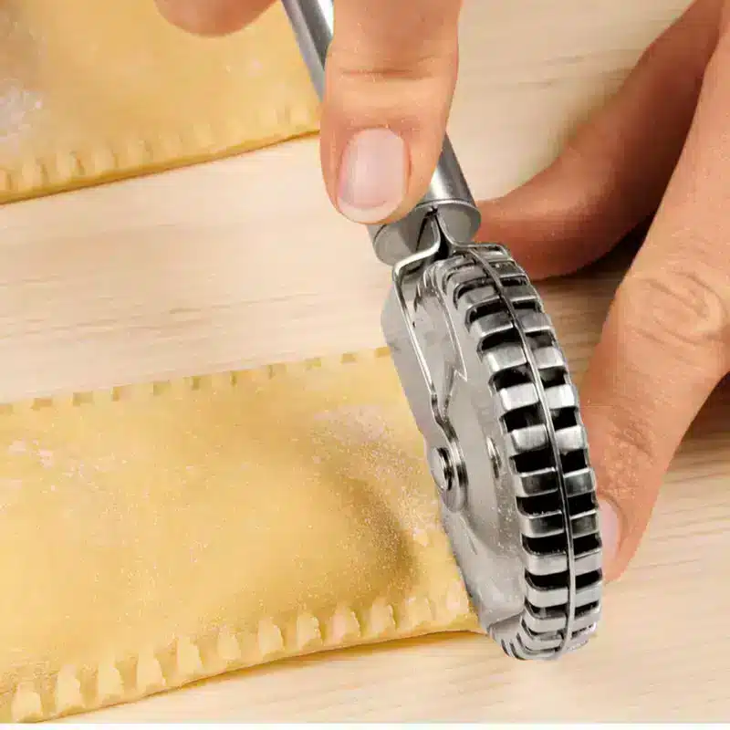 Das Teigrad versiegelt Ränder beim Schneiden sicher, beim Kochen kann daher kein Wasser eindringen. Ravioli, Maultaschen, Blätterund Hefeteigtaschen gelingen kinderleicht. Tipp: Damit der Nudelteig nicht anklebt, mit dem Teigrädchen zuerst durch etwas Mehl radeln. Dank der Öse am Griffende kann der praktische Küchenhelfer bequem an einem Haken «geparkt» werden. Geeignet für Nudel-, Hefe-, Blätter- und Mürbeteig. Edelstahl, spülmaschinenfest, Ø 6,5 cm und 20 cm lang. | ZUM PRODUKT – HIER KLICKEN |