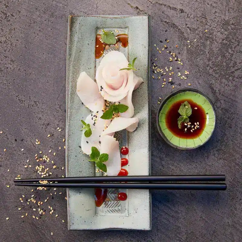 Erleben Sie das ultimative Geschmackserlebnis mit unserem Blue Cobia Sashimi usuzukuri! Unser frischer Blue Cobia Fischfilet wird mit feinster Präzision zu 2mm dünnen, durchscheinenden Blättchen aufgeschnitten und auf vorgekühlten Vorspeisentellern als Rosette ausgelegt. Verfeinert wird das Aroma durch Limetten und eine delikate Vinaigrette aus Soja Ponzu Sauce, Chili Sauce und Sesamöl. Mit einer dekorativen Minz- oder Koriandergarnitur wird das Augen- sowie Gaumenerlebnis perfekt abgerundet. Probieren Sie jetzt unser Blue Cobia Sashimi usuzukuri! | ZUM REZEPT – HIER KLICKEN |
