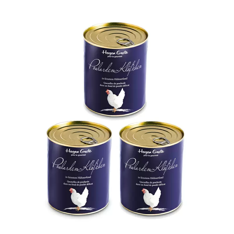 Allerfeinstes Poularden-Fleisch wird mit sorgfältig abgestimmter Gewürzmischung in unserer Delikatessen-Manufaktur zu kleinen Bällchen geformt. Die delikaten Klößchen aus geschmackvollem Geflügelfleisch werden in aromatischem Hagen Grote Geflügelfond pochiert und mit Weißwein verfeinert. Für die weitere Verwendung fertig zubereitet enthält jede Dose etwa 16 Poularden-Klößchen (320 g). Mit Sahne, Curry, Safran oder Kräutern verfeinert, lassen sich aus dem delikaten Fond wundervolle Saucen oder auch attraktive Ragouts zubereiten.