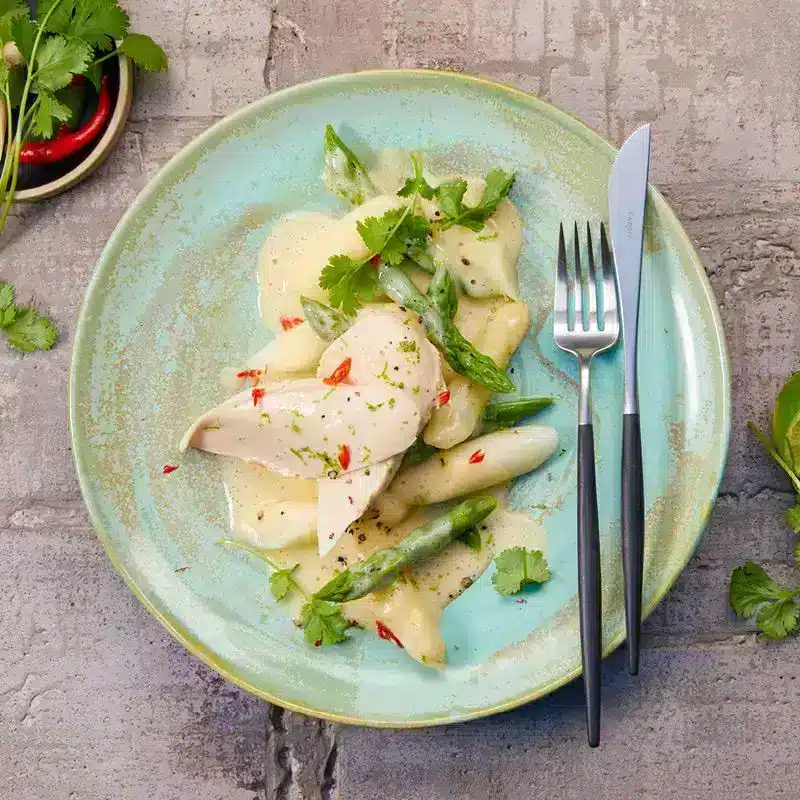 Erleben Sie ein kulinarisches Abenteuer mit unserem Rezept In Kokosmilch pochierten Low Carb Geflügelbrust mit Spargel! Lassen Sie sich von der Kombination aus saftiger Geflügelbrust und dem frischen Geschmack von Spargel begeistern. Die Geflügelbrust wird zusammen mit Zitronengras und Kokosmilch zart gegart, um ihr volles Aroma zu entfalten. Die cremige Kokos-Sahnesauce und die knackigen Spargelstücke runden das Geschmackserlebnis perfekt ab. Probieren Sie es jetzt aus und überzeugen Sie sich selbst von der herrlichen Geschmackskombination! | ZUM REZEPT – HIER KLICKEN |