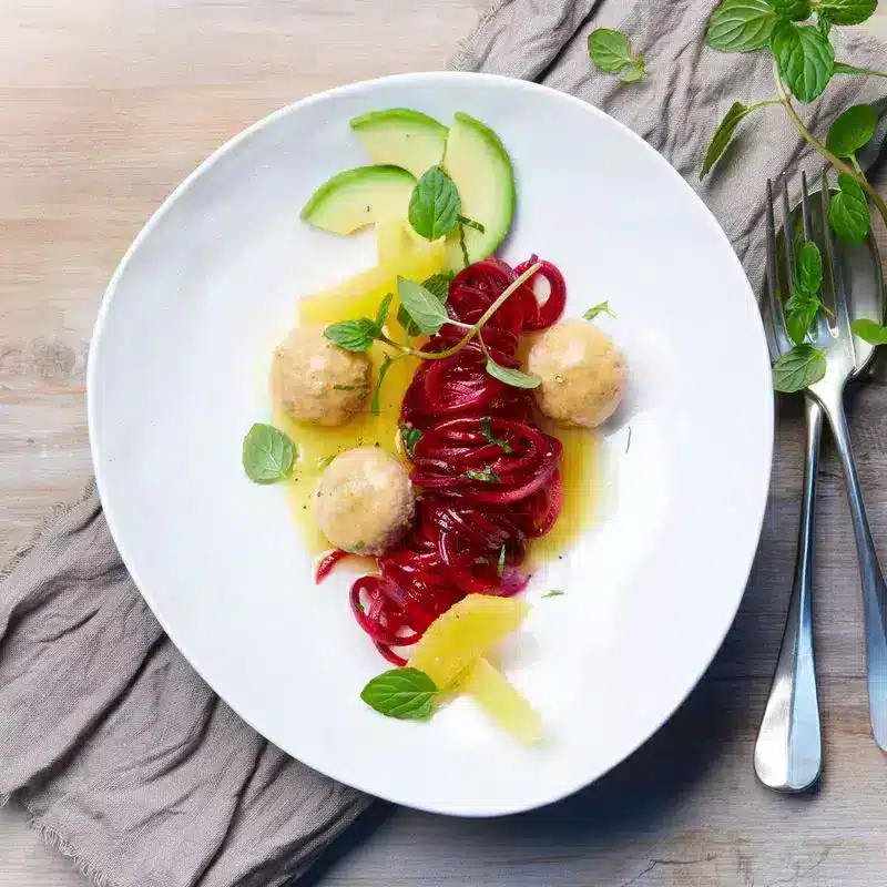 Genießen Sie ein gesundes und köstliches Abendessen mit unseren Low-Carb Poularden Klößchen in Orangensauce mit Rote Bete Nudeln! Die Poularden Klößchen sind im Geflügelfond gegart und werden mit einer frischen Orangensauce abgerundet, die mit Ingwer, Schalotte und Zitrone aromatisiert ist. Die Rote Bete Nudeln aus den beliebten roten Knollen sind eine low-carb Alternative zu herkömmlichen Nudeln und werden mit frischen Orangenfilets und Avocado-Streifen garniert. Etwas Minze rundet das Gericht ab und sorgt für eine erfrischende Note. Gönnen Sie sich ein Geschmackserlebnis, das sowohl Ihren Geschmacksnerven als auch Ihrem Körper gut tut! | ZUM REZEPT – HIER KLICKEN |