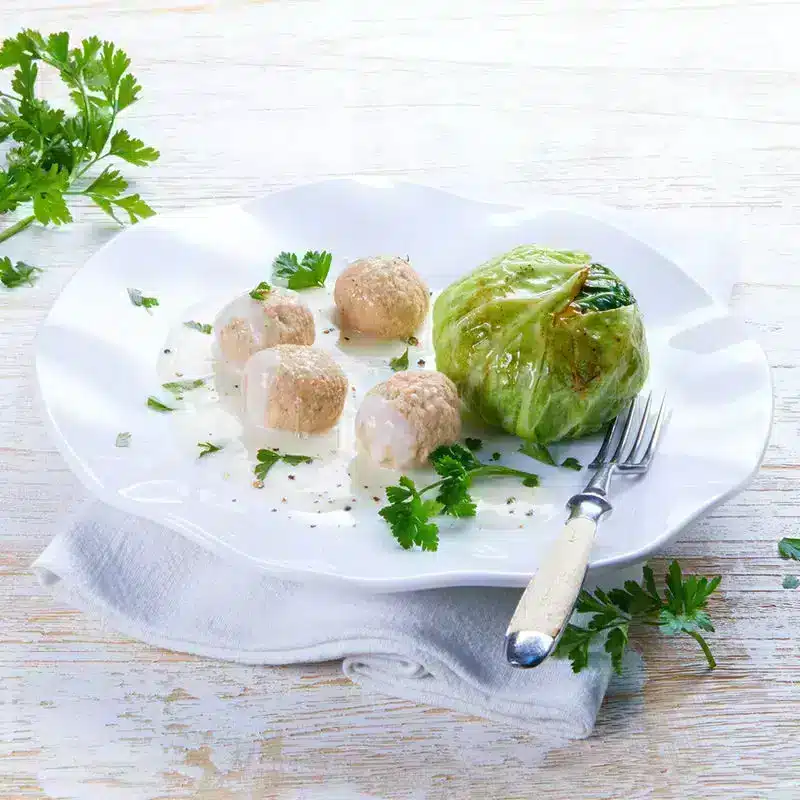 Jetzt ansehenLassen Sie sich von einem unwiderstehlichen Low Carb-Gericht verführen: Poularden Klößchen auf Weißweinsauce, serviert mit würzigen Wirsingbällchen! Dieses Rezept ist der Beweis, dass man auch bei einer Low Carb-Diät nicht auf Geschmack und Abwechslung verzichten muss. Die Wirsingbällchen sind eine perfekte Kombination aus saftigem Gemüse und sämiger Crème fraîche, während die Poularden Klößchen in einer herrlich cremigen Weißweinsauce serviert werden. Verfeinern Sie das Gericht mit einem Hauch frischer Petersilie und erleben Sie ein unvergessliches Geschmackserlebnis! | ZUM REZEPT – HIER KLICKEN |