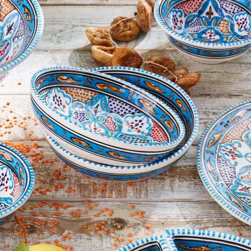 Ein handverlesenes Team fertigt in einer tunesischen Manufaktur in der Nähe von Nabeul diese künstlerisch hochwertig gestalteten orientalischen Suppen- und Salatschalen. Das typisch arabische, ornamentale Dekor wird in aufwendiger Handmalerei aufgetragen. Sein kräftiges Türkis erinnert an die Farbe des Mittelmeers vor der tunesischen Küste. Jede Schale ist ein individuell gestaltetes Unikat. Nicht nur typisch arabischen Suppen oder Salaten bieten die Kunstwerke mit ihren intensiven Farben einen exklusiven, orientalisch inspirierten Rahmen.