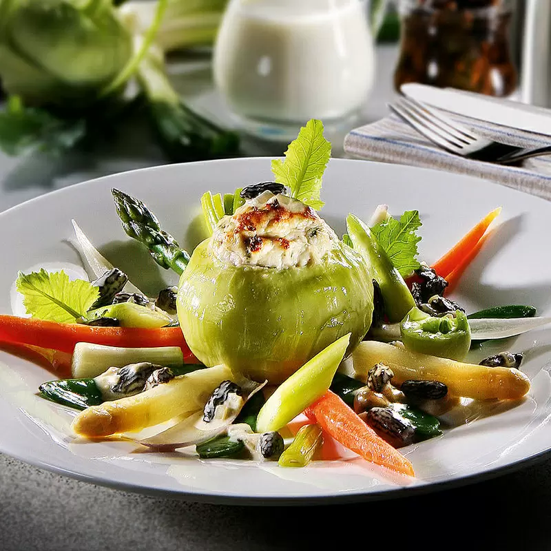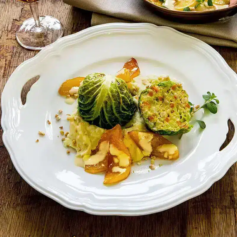 Lassen Sie sich von unserem würzigen Rezept für Wirsingbällchen auf Mandel-Kartoffelschaum mit karamellisierten Apfelspalten verführen! Dieses köstliche Gericht ist perfekt für den Herbst und vollgepackt mit gesundem Gemüse wie Wirsing, Porree, Möhren und Sellerie. Die Wirsingbällchen werden in einer pikanten Sahne-Weißwein-Sauce serviert und mit würzigem Majoran, Salz, Pfeffer und Muskatblüte verfeinert. Dazu gibt es einen cremigen Mandel-Kartoffelschaum und karamellisierte Apfelspalten für eine süße Note. Probieren Sie es aus und lassen Sie sich von diesem wunderbaren Geschmackserlebnis begeistern! | ZUM REZEPT – HIER KLICKEN |