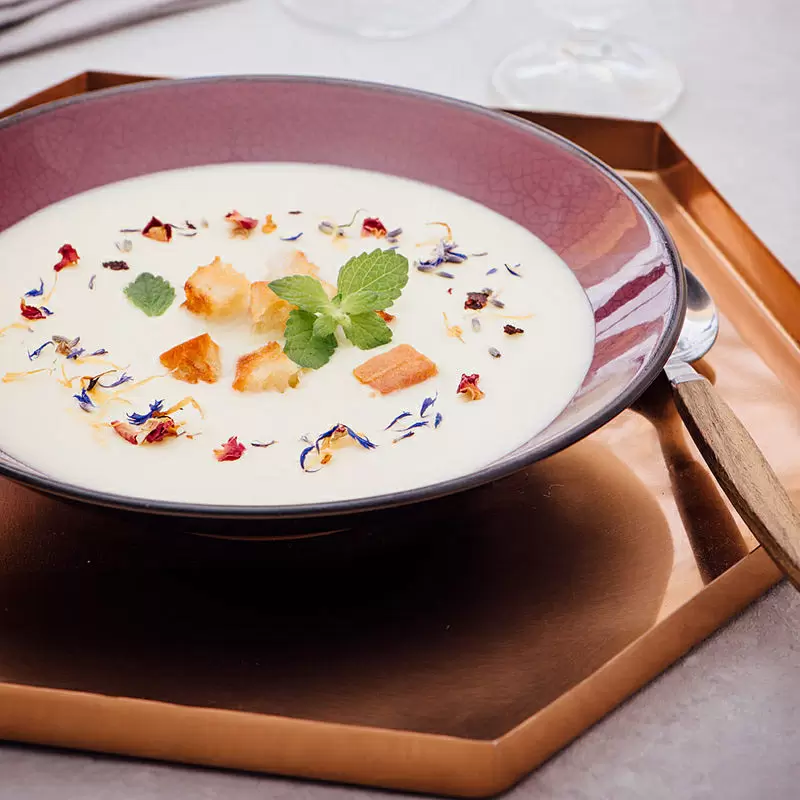 Probieren Sie unseren leckeren Spargel-Gazpacho mit Knoblauch-Croutons – eine würzig-aromatische, erfrischende und kühle Suppe, die perfekt für den Frühling ist! Der Gazpacho wird aus weißem Spargel, Mandeln, Zitronenmelisse, Gemüsebrühe, Olivenöl, Salz und Sherry-Essig zubereitet. Die Zutaten werden im Mixer püriert, bis sie eine homogene Konsistenz haben. Die Knoblauch-Croutons werden aus Baguette, Knoblauch und Butter hergestellt und in der Pfanne angebraten, bis sie knusprig und goldbraun sind. Serviert wird der Gazpacho kalt, garniert mit den Knoblauch-Croutons. Erleben Sie die unglaubliche Aromenvielfalt dieses Rezepts! | ZUM REZEPT – HIER KLICKEN |