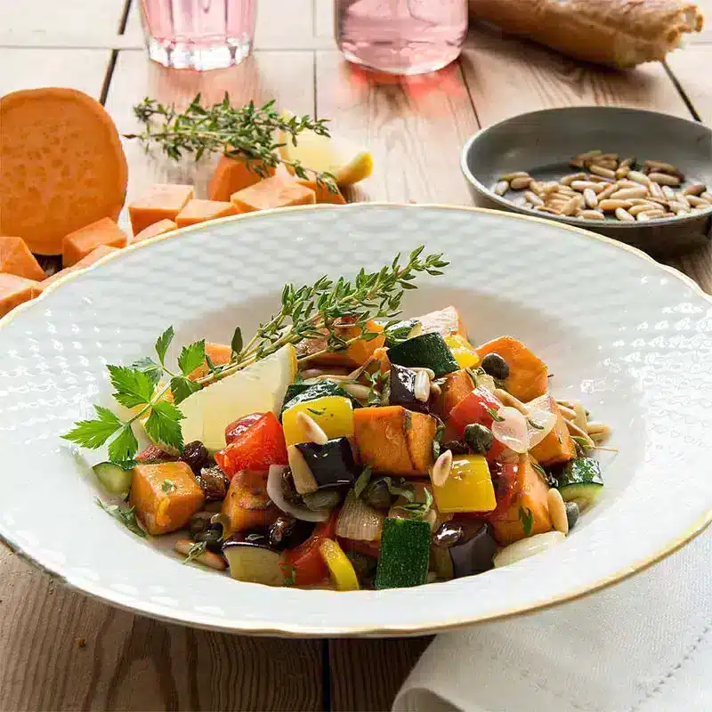 Probieren Sie unser herzhaftes Süßkartoffel-Auberginen Caponatina! Diese köstliche Beilage wird aus frischen Süßkartoffeln, aromatischen Paprikas, Auberginen und Zucchini zubereitet und mit würzigem Knoblauch, Pinienkernen, Rosinen, Zucker, Salz, Pfeffer, Thymian, Kapern und Zitronenschale verfeinert. Anschließend wird die Caponatina mit Weißwein abgelöscht und mit glatter Petersilie garniert. Probieren Sie es aus und lassen Sie sich von diesem würzigen Geschmack verführen! | ZUM REZEPT – HIER KLICKEN |