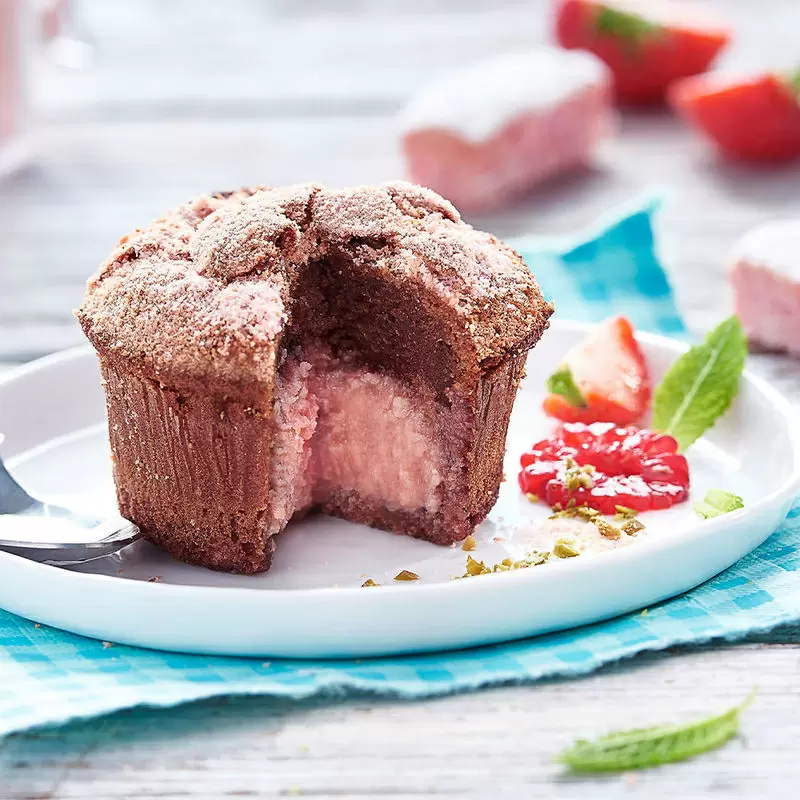 Warme Schokoladentörtchen mit rosa Biskuit-Füllung