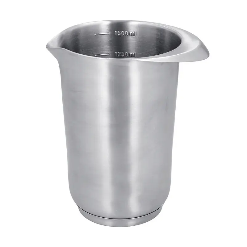 Auf dem gebürsteten Edelstahl bleiben Fingerspuren unsichtbar. Ein rutschfester (zum Reinigen abnehmbarer) Silikon-Bodenring sorgt für sicheren Stand. Griffe bieten festen Halt beim Aufschlagen. Innere Skalierungen erlauben sicheres Abmessen, tropffreier Ausgießer.