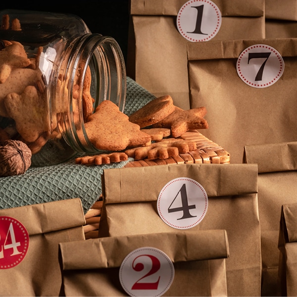 Besonders praktisch für Adventskalender sind bereits entsprechend vornummeriert Verpackungen. Ansonsten eignen sich Zahlen-Aufkleber oder Holz-Wäscheklammern mit Zahlen. Besonders umweltfreundlich und nachhaltig sind Verpackungen, die im nächsten Jahr erneut verwendet werden können.