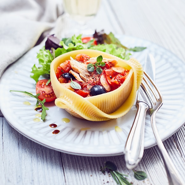 Feine Pasta- und Reisgerichte aus der Hagen Grote Küche, die Sie in die Mittelmeerernährung integrieren können, sind Orecchiette Öhrchen-Nudeln, Zitronen-Zabaione und Gemüse-Julienne, Penne Rigate mit Zitronen-Pesto und Burrata, köstlich gefüllte Caccavelle alla siciliana ripiene di tonno bianco und vegetarische Paella «Paella de verduras».