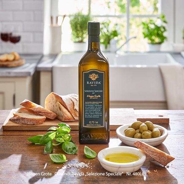 Exklusiv für Hagen Grote wird Ravidà Olivenöl «Selezione Speciale» aus 3 erlesenen, alten Olivensorten hergestellt. Auf dem sizilianischen Landgut «La Gurra» wachsen sie an mehr als 300 Jahre alten Olivenbäumen. Schonend wird das hocharomatische Öl noch am Tag der Ernte kaltgepresst (nativ extra). Mit seiner leichten Süße und feinen Fruchtnoten bereichert es sämtliche Speisen der mediterranen Küche.