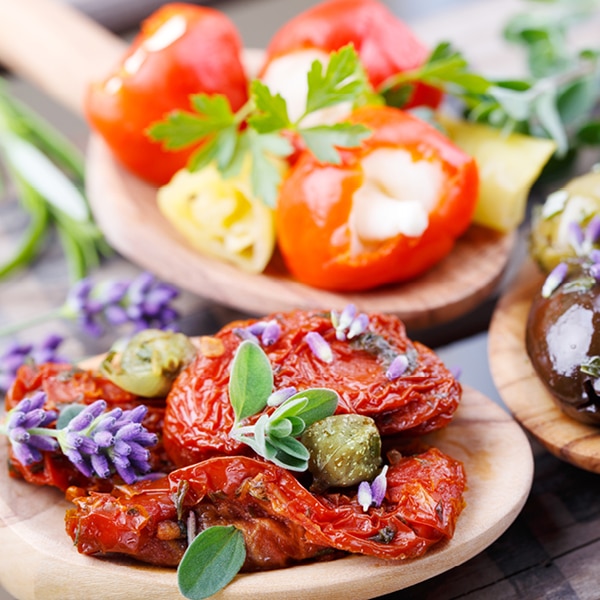 Mediterranes Gemüse wie Paprika, Tomaten, Zucchini, Artischocken, Mangold, Oliven, Auberginen und Fenchel enthält viele sekundären Pflanzenstoffe, die Herz und Gefäße schützen. Insbesondere die Tomate kann mit einem großen Anteil des sekundären Pflanzenstoffs Lycopin punkten, der vorbeugend gegen Arterienverkalkung und Schlaganfälle wirkt. Übrigens: Aufgrund der starken Konzentration enthalten Tomaten-Produkte wie Passata oder Tomatenmark Lycopin sogar in noch größeren Mengen als frische Tomaten.