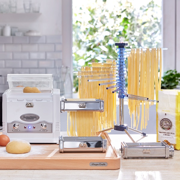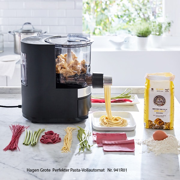 Mit unserer Elektro-Pastamaschine gelingen in nur drei Minuten bis zu 500 g perfekte Pasta. Die drei im Lieferumfang enthaltenen Aufsätze schneiden auf Knopfdruck Spaghetti und Fettuccine oder fertigen Lasagneplatten an. Die absolut gleichmäßig ausgewalzten Teigplatten lassen sich außerdem zu gefüllten Pasta-Spezialitäten, wie etwa Tortellini oder Maultaschen, weiterverarbeiten. Zusätzlich erhältlich sind weitere Aufsätze, mit denen Sie auch Linguine und Vermicelli herstellen. Außerdem lassen sich auch Pizza-, Brot- oder Plätzchenteig mit der Pastamaschine fertigen.
