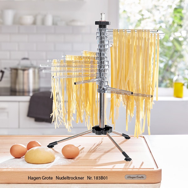 Für längere Sorten wie Spaghetti oder Linguine eignet sich am besten ein Nudeltrockner. Unser lebensmittelgerechter Spezialständer stellt eine ausreichende Luftzufuhr sicher und bietet mit seinen 15 fächerförmig angeordneten Trägern Platz für bis zu 2 kg Nudeln. Wird er nicht mehr gebraucht, verschwinden seine Arme platzsparend im Inneren.
