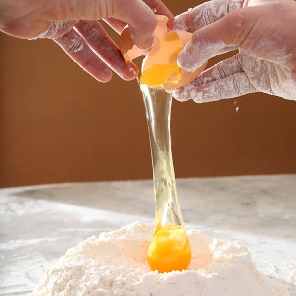 Ideal ist für Pasta jedoch das besonders feinkörnige Weichweizenmehl Typ 00, wie unser hochwertiges Pastamehl «La Triplozero®», das seit 1832 in der Mühle Dallagiovanna in der Emilia Romagna hergestellt wird. Die spezielle Reinigung jedes einzelnen Weizenkorns sowie das überaus schonende, dreifache Vermahlen sind das Geheimnis seiner außergewöhnlichen Qualität. Optimal bindet das Pastamehl die Flüssigkeit und sorgt so dafür, dass der Teig besonders reißfest gelingt. Für einen nussigeren Geschmack können auch Dinkelmehle (Typ 630, 812, 1050) verwendet werden. Für Vollkornnudeln oder Nudeln mit Vollkornanteil lassen sich entsprechend Vollkornmehle nutzen. Pastateig mit Ei verfügt über einen aromatischen Geschmack sowie, bei der Verwendung heller Mehle, über eine schönere Farbe.