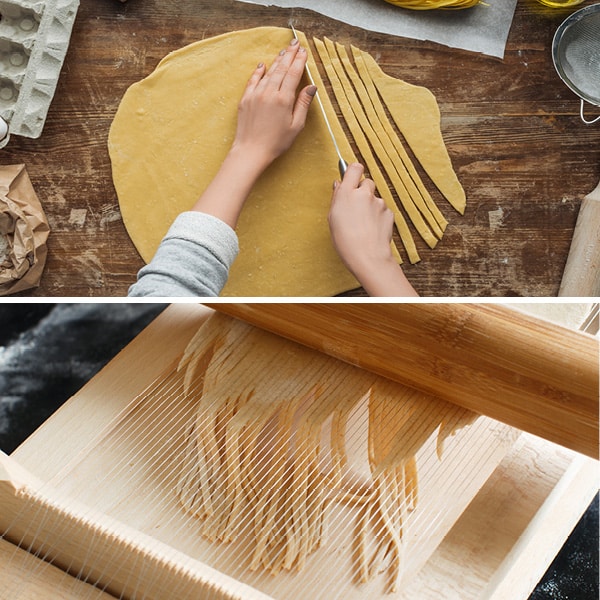 Einige Nudelsorten lassen sich jedoch auch ohne professionelle Pastamaschine herstellen. Dazu teilt man den fertigen Nudelteig in einzelne Portionen und rollte diese mit einer Teigrolle auf der bemehlten Arbeitsfläche möglichst gleichmäßig aus. Für Spaghetti, Linugine und Bandnudeln ist eine Dicke von 1 mm ideal, für Lasagneplatten 2 mm. Den fertig ausgerollten Teig für etwa fünf Minuten antrocknen lassen und anschließend in die gewünschte Form schneiden.