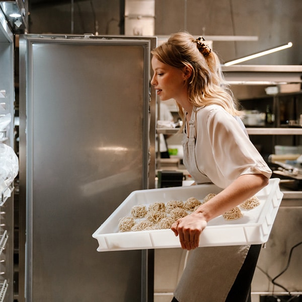 Auch durch Einfrieren lässt sich selbstgemachte Pasta haltbarmachen. Dazu müssen die Nudeln zunächst auf einem Backblech angefroren werden. Das Blech dazu leicht mit Hart- oder Weichweizengrieß bestreuen. Wie beim Trocknen kurze Pasta-Sorten mit genügend Abstand auf das Blech legen, längere Nudeln zu mehreren Nestern formen. Je nach Pasta-Form und Leistung des Tiefkühlgeräts dauert es etwa eine Dreiviertelstunde, bis die Nudeln durchgefroren sind. Nun können sie platzsparend in geeignete Dosen oder Gefrierbeutel verpackt werden.