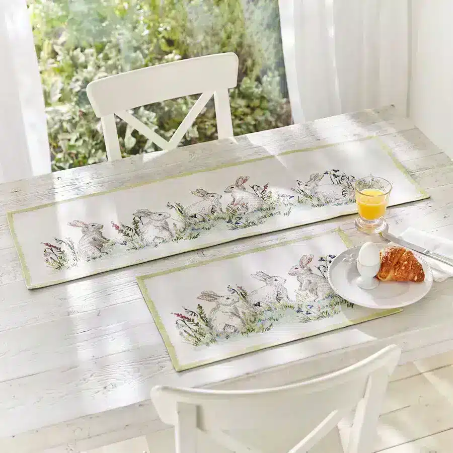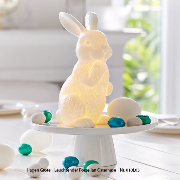 Eine wunderschöne Osterdekoration ist unser von Hand gefertigter, leuchtender Porzellan Osterhase, der in zwei Größen erhältlich ist. Detailgetreu gestaltet erstrahlt er mittels innovativer LED-Technik in angenehmem, warmweißem Licht. Dank drei langlebiger Knopfzellen geht das ganz ohne Kabel. Besonders schön sind machen sich kleiner und großer Hase in Kombination.Besonders schön in Szene setzen Sie Ihren festlich gedeckten Ostertisch mit unserer Hasen-Tischdecke. Hochwertig bedruckt mit detailreichen Hasen, Blüten und Blätterranken in dezenten Farben erzeugt eine herrliche Frühlingsstimmung. Optimal schützt der widerstands- und strapazierfähige Stoff wertvolle Oberflächen. Auch als Mitteldecke, Tischläufer oder Kissen erhältlich.