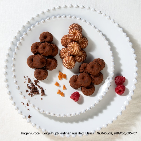 Die ikonische Form des Gugelhupfs, eine traditionell elsässische Spezialität, dient als Vorlage für unsere exquisiten Pralinen. Mit viel Liebe zum Detail und besten Zutaten gefertigt, vereinen sie handwerkliche Kunst und puren Genuss. Bestäubt mit feinstem Kakao, schmelzen die kleinen Meisterwerke förmlich auf der Zunge. Erhältlich sind sie in den Sorten Klassisch mit feiner Trüffelfüllung, Crème brûlée und Himbeere.