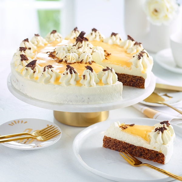 Ebenfalls ein Genuss zum Osterkaffee ist klassischer Orangen-Mandelkuchen aus der Provence. Nach traditionellem Rezept wird er aus hochwertigen, regionalen Zutaten wie frischen Freilandeiern, feiner Fassbutter und gemahlenen Mandeln (Anteil 32 %) gefertigt. Zu einem besonderen Genusserlebnis machen ihn seine herrlich saftige Textur sowie die frische Orangen-Note.