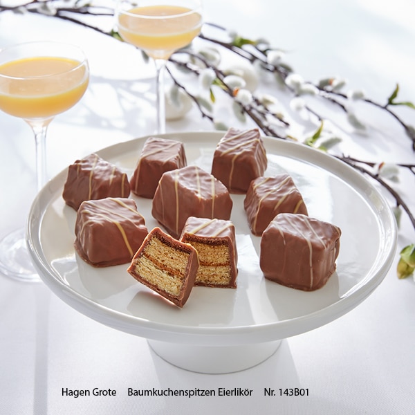 Nach klassischem, altschlesischem Rezept entstehen unsere feinen Baumkuchenspitzen mit Eierlikör. Traditionell Schicht für Schicht gebacken veredelt er cremige Likör diese edle Kuchen-Delikatesse. Zartschmelzende, belgische Schokolade umhüllt die köstlichen Gebäckstücke.