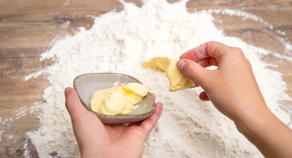 Feine Sauce mit Butter binden sollte erst direkt vor dem Servieren erfolgen, da diese Emulsion schnell zerfällt. Im Kühlschrank vorgekühlte Butter in kleinere Stücke teilen. Die Sauce vom Feuer nehmen und die Butter in Stücken mit dem Schneebesen oder besser mit dem Pürierstab unter die Sauce montieren. Dafür eignet sich Süßrahmbutter besser als die schneller ausflockende Sauerrahmbutter.