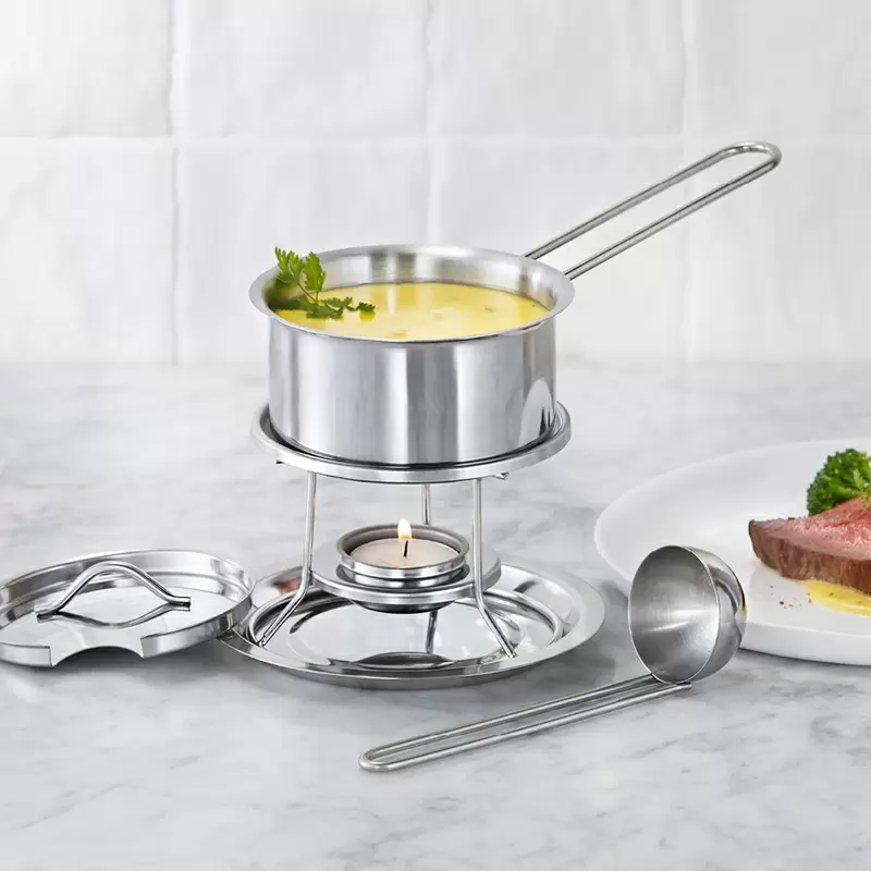 Mit diesem Teelicht-Edelstahlstövchen bleiben Saucen, zerlassene Butter sowie Dessertsaucen über einen langen Zeitraum warm. Dank des 0,6 Millimeter starken Edelstahls hält der Saucenwärmer die Temperatur zuverlässig konstant.