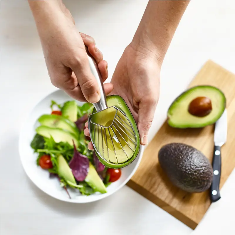 Einfach den Schneider auf eine reife, entsteinte Avocadohälfte setzen und durch das Fruchtfleisch ziehen. Dank angepasster ovaler Form des Werkzeugs wird die Avocadohälfte vollständig ausgelöst.