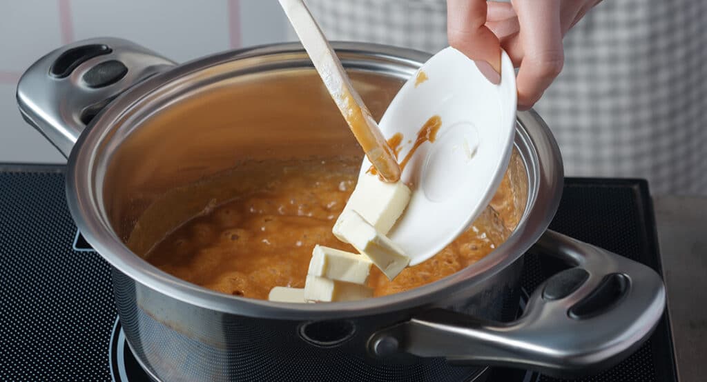 Feine Sauce mit Butter binden sollte erst direkt vor dem Servieren erfolgen, da diese Emulsion schnell zerfällt. Im Kühlschrank vorgekühlte Butter in kleinere Stücke teilen. Die Sauce vom Feuer nehmen und die Butter in Stücken mit dem Schneebesen oder besser mit dem Pürierstab unter die Sauce montieren. Dafür eignet sich Süßrahmbutter besser als die schneller ausflockende Sauerrahmbutter.