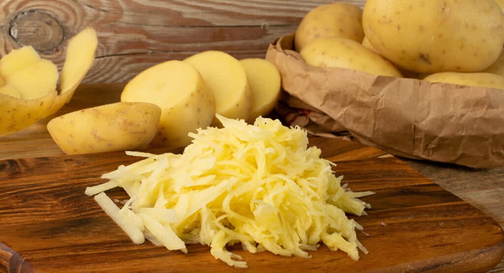 Angenehm sämig und natürlich bindet man leckere dunkle Bratensaucen mit roher Kartoffel. Für etwa 400 ml flüssiger Sauce eine mittelgroße geschälte Kartoffel ganz fein reiben und 5 Minuten mit der Sauce kochen. Als feine helle Gemüse-, Geflügel- oder Fischsauce 250 ml Fond, 200 ml Crème fraîche, 50 ml Weißwein oder Noilly Prat mit einer geriebenen Kartoffel 5 Minuten kochen, passieren und mit Salz und Pfeffer würzen.