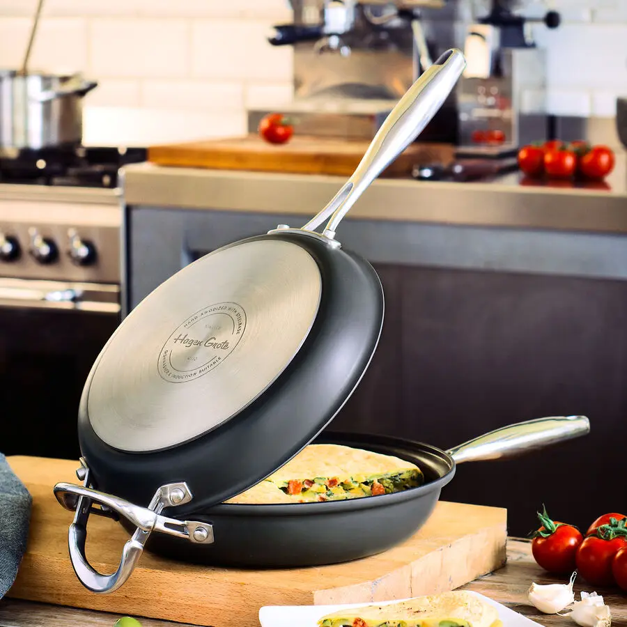Ober- und Unterpfanne sind vollwertige Einzelpfannen. Am Gegengriff fest miteinander verbunden, verwandeln sie sich zur Wendepfanne. Sicher drehen Sie darin jeden Inhalt, ob halbflüssige Omeletts oder unfertige Frittatas.