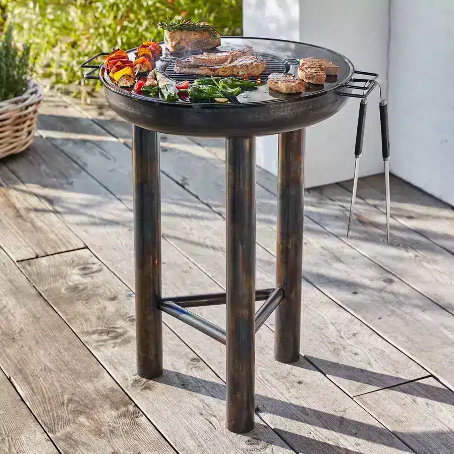 Dank integrierter geschlossener Plancha-Elemente aus emailliertem Edelstahl bereiten Sie auf dieser Feuerschale nicht nur Fleischspieße, Steaks oder Würste auf natürliche Weise zu.